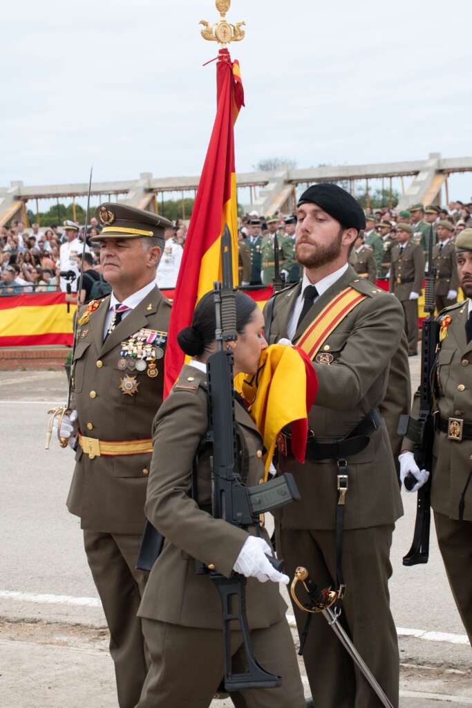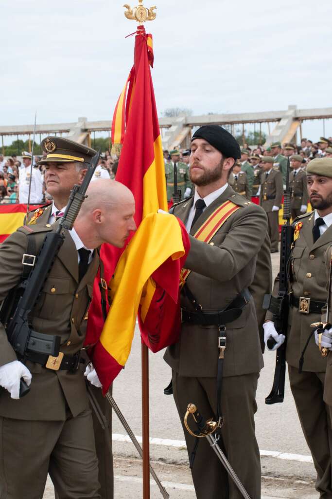 Seguidamente, con el sable cruzado sobre la Bandera, el coronel director, recitó la fórmula del Juramento, mientras la fuerza permanecía en la posición de ‘arma presentada’. A continuación, al son de marchas militares, los nuevos soldados pasaron de uno en uno ante la Bandera o Estandarte correspondiente, ratificando así su compromiso con España.