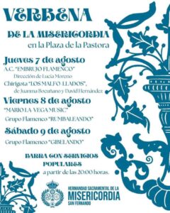 La Verbena de la Misericordia contará con una variada y animada programación artística durante sus tres días de celebración. El jueves 7 de agosto abrirá el escenario la Asociación Cultural ‘Embrujo Flamenco’, bajo la dirección de Lucía Moreno, con los grupos de baile; 'Embrujo Flamenco'