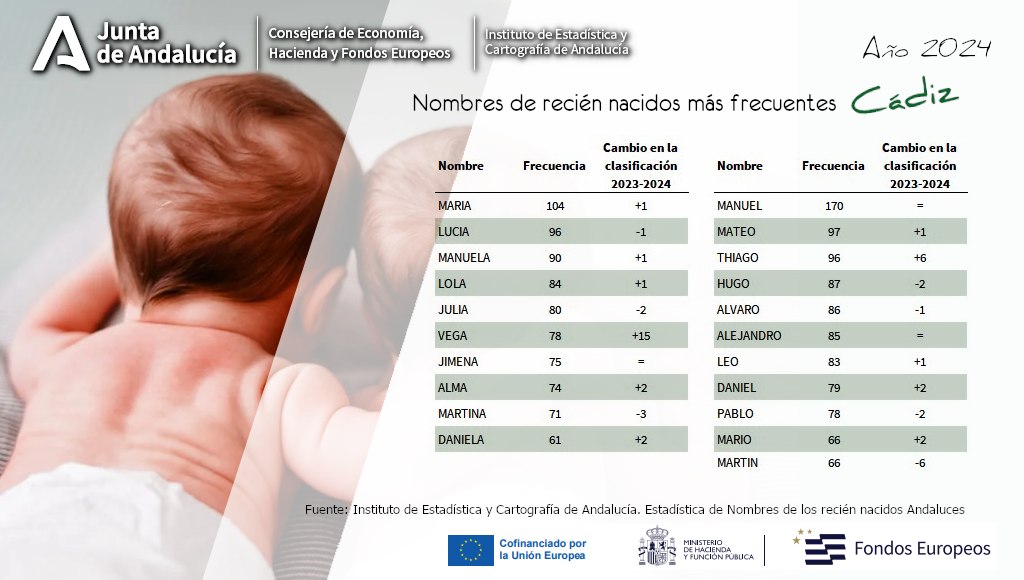 Nombres de recién nacidos más frecuentes en Cádiz. Año 2024