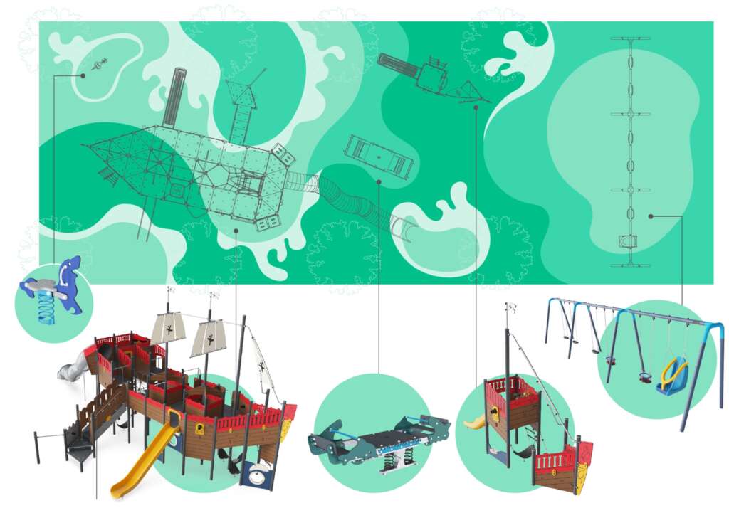 Por otro lado, un barco más pequeño tipo carabela formado por una variedad de juegos para todos los niños, como tobogán, prismáticos, escalera de cuerda, hamaca, ruedas giratorias, escritorio, con espacios para socializar y promover el sentido del equilibrio de los niños.