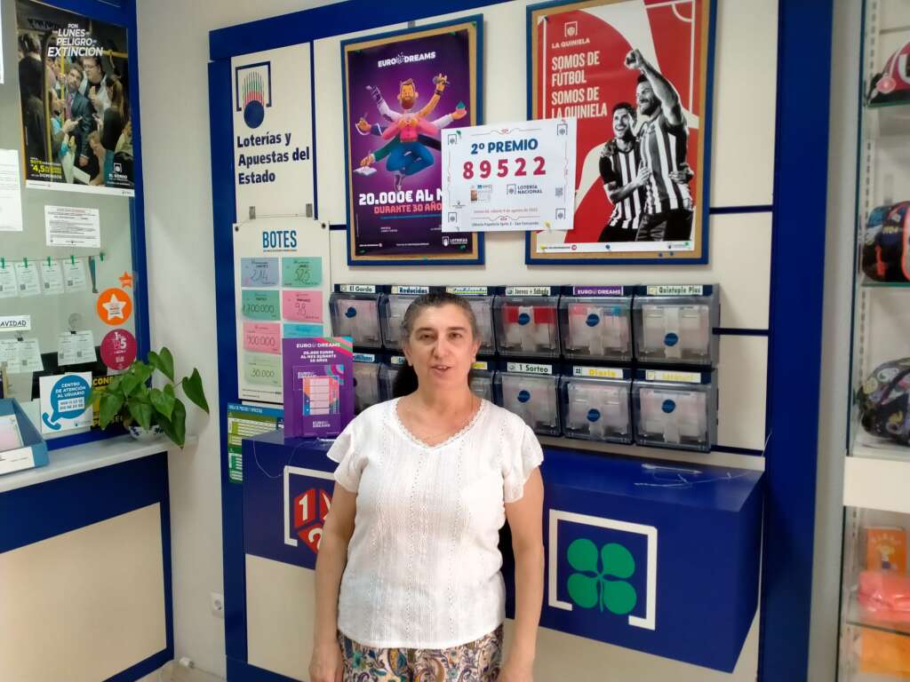 Loli Pina feliz mostrando el segundo premio repartido en su administración de la calle Manuel de falla - El Castillo de San Fernando