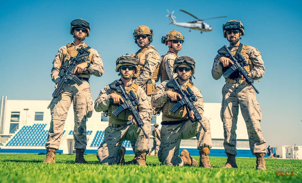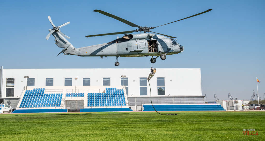 El acto se desarrolló en la Junta de Educación Física y Deportes de la Armada, donde un helicóptero SH60F de la Quinta Escuadrilla de la Flotilla de Aeronaves de la Base Aeronaval de Rota realizó una aproximación para el desembarco de un equipo de fusileros de la Novena Compañía del Tercer Batallón de Desembarco de la Brigada de Infantería de Marina ‘Tercio de Armada’ mediante la operación ‘Fast Rope’.