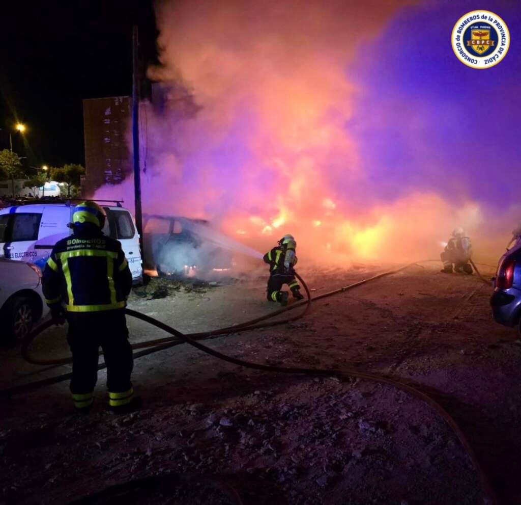 Según el Consorcio de Bomberos de la provincia de Cádiz, los efectivos del Parque de San Fernando llegaron al lugar y constataron cinco vehículos ardiendo en su totalidad, procediendo a su extinción. La intervención, que contó con 5 bomberos y 2 vehículos —una autobomba urbana ligera (P-40) y una pesada (U-36)—, se prolongó durante aproximadamente hora y media, utilizando 3.000 litros de agua.