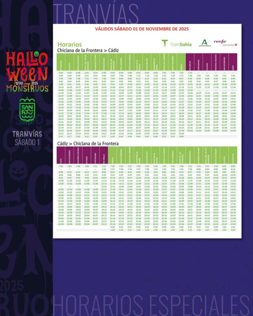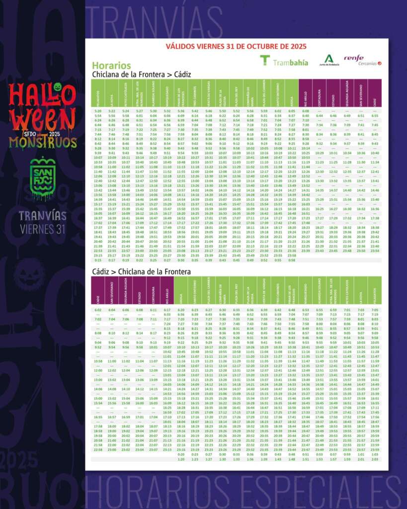 Esta mejora del servicio del Trambahía por parte de la Junta de Andalucía se lleva a cabo con la coordinación de las fuerzas de seguridad locales y la colaboración necesaria del Ayuntamiento de San Fernando, que organiza el programa de actividades de Halloween Monstruos para este año 2025.