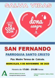Una vez más desde CTTC de Cádiz piden a la población isleña que donen sangre y plasma, por lo que convocan una nuevas recolecta -en horario de mañana (de 17:30 a 21:30 horas)-, el próximo miércoles 5 de noviembre de 2025 en la Parroquia Santo Cristo,-Plaza Madre Teresa de Calcuta-.