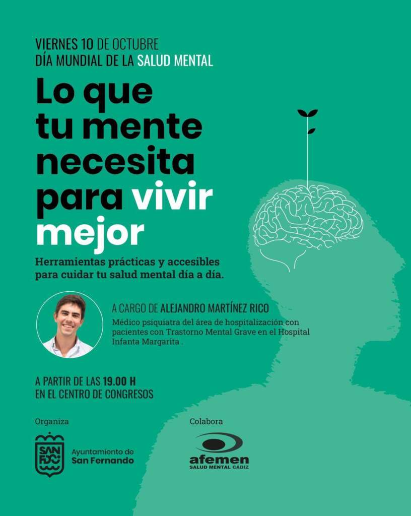 Con motivo del Día Mundial de la Salud Mental, el Ayuntamiento de San Fernando ha organizado una conferencia titulada Lo que tu mente necesita para vivir mejor, que se celebrará el próximo viernes 10 de octubre a las 19:00 horas en el Centro de Congresos Cortes de la Real Isla de León.