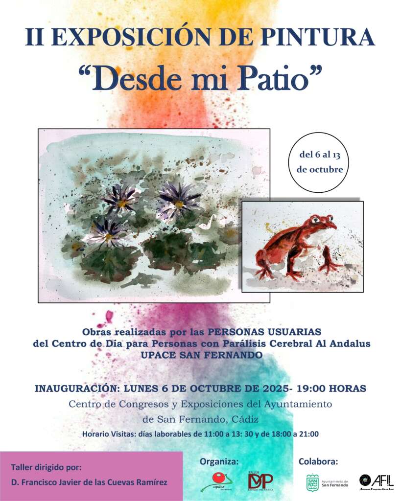 Entre las iniciativas destaca la II Exposición de Pinturas ‘Desde mi patio’, que se podrá visitar en el Centro de Congresos de San Fernando del 6 al 10 de octubre. La inauguración contará con una invitación especial y se centrará en acercar al público la creatividad de las personas con parálisis cerebral.