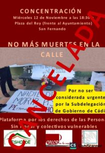 La Plataforma por los Derechos de las Personas Sin Hogar y Colectivos Vulnerables ha anunciado la desconvocatoria de la concentración prevista para este miércoles 12 de noviembre en la plaza del Rey, convocada para expresar su dolor y exigir medidas tras el fallecimiento en la calle de Pepi D., una mujer sin hogar en San Fernando.