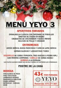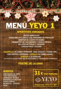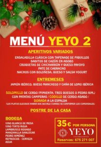 El Menú Yeyo 1, con un precio de 31 euros por persona, incluye una selección de aperitivos variados entre los que se encuentran queso manchego, ensaladilla clásica con tapenade de piquillos, daditos de cazón en adobo, croquetas de chicharrón y queso Payoyo, delicias de pollo con cheddar y langostinos cocidos. Como plato principal, los comensales pueden elegir entre solomillo de cerdo (pimienta, tres quesos o Pedro Ximénez) con patatas camperas, codillo de cerdo asado o dorada a la espalda. El menú se completa con postre de la casa y bodega con vino blanco, tinto Rioja, lambrusco rosado, manzanilla sanlúcar, Pedro Ximénez, refrescos, cerveza y agua.