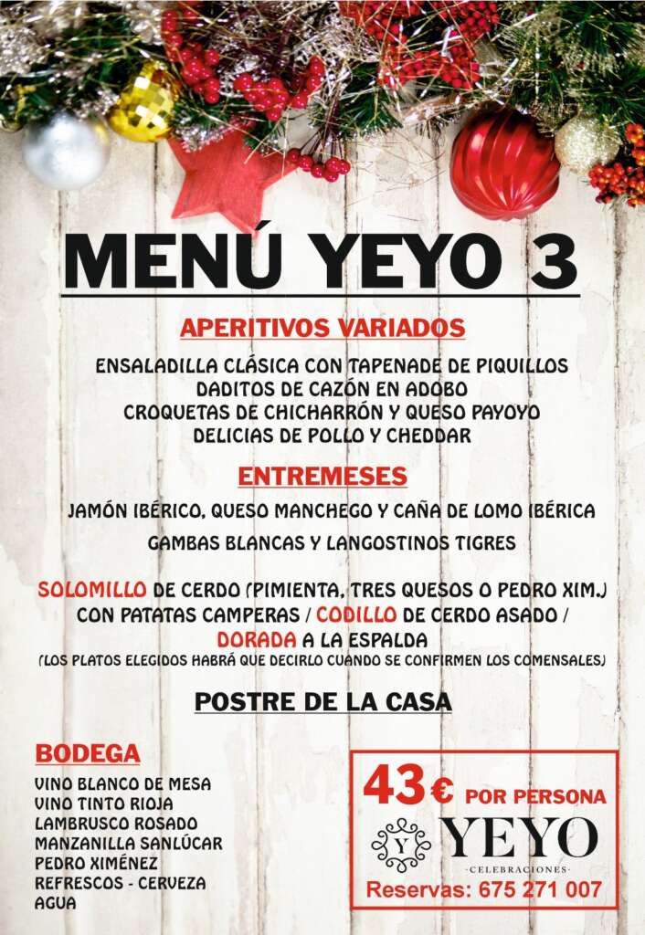 El Menú Yeyo 1, con un precio de 31 euros por persona, incluye una selección de aperitivos variados entre los que se encuentran queso manchego, ensaladilla clásica con tapenade de piquillos, daditos de cazón en adobo, croquetas de chicharrón y queso Payoyo, delicias de pollo con cheddar y langostinos cocidos. Como plato principal, los comensales pueden elegir entre solomillo de cerdo (pimienta, tres quesos o Pedro Ximénez) con patatas camperas, codillo de cerdo asado o dorada a la espalda. El menú se completa con postre de la casa y bodega con vino blanco, tinto Rioja, lambrusco rosado, manzanilla sanlúcar, Pedro Ximénez, refrescos, cerveza y agua.