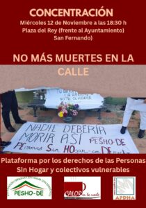 Bajo el lema 'Nadie debería morir así', la Plataforma por los Derechos de las Personas sin Hogar, denuncia la necesidad de que nadie tenga que verse obligado a vivir y dormir en la calle sin un alojamiento alternativo donde poder refugiarse. La entidad hace un especial hincapié en la situación de las mujeres ya que a día de hoy no existen plazas disponibles en el albergue para ellas. Este ha sido el caso de Pepi D. quien ha fallecido este lunes 10 de noviembre en la calle sin posibilidad de acceder al albergue de San Fernando.