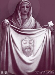 El cartel nos muestra a la Santa Mujer Verónica sostiendo el paño con la imagen de Nuestro Padre Jesús Nazareno, regidor perpetuo de San Fernando. A nivel técnico, la obra bebe del tenebrismo y los claroscuros propios del Barroco. Los dibujos que componen el cartel están realizados a grafito sobre papel, mientras que el uso del color y la composición final se han desarrollado mediante técnicas digitales. La gama cromática, dominada por tonos vino tinto, alude simbólicamente a la sangre de Cristo, estableciendo un vínculo directo con el significado del velo con el que la Verónica enjugó el rostro del Señor durante su camino al Calvario.