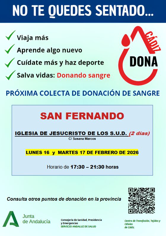 La Red Andaluza de Medicina Transfusional, Tejidos y Células de la Consejería de Salud y Familias una vez más hace un llamamiento urgente a los isleños para acudan a donar sangre y plasma con el fin de garantizar para cubrir las necesidades de los centros sanitarios de San Fernando.