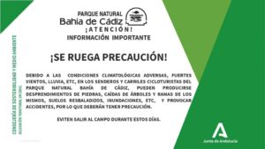 La dirección del Parque Natural Bahía de Cádiz ha lanzado un aviso a la ciudadanía ante las condiciones climatológicas adversas que se están registrando en estos días, con el objetivo de evitar riesgos y posibles accidentes.