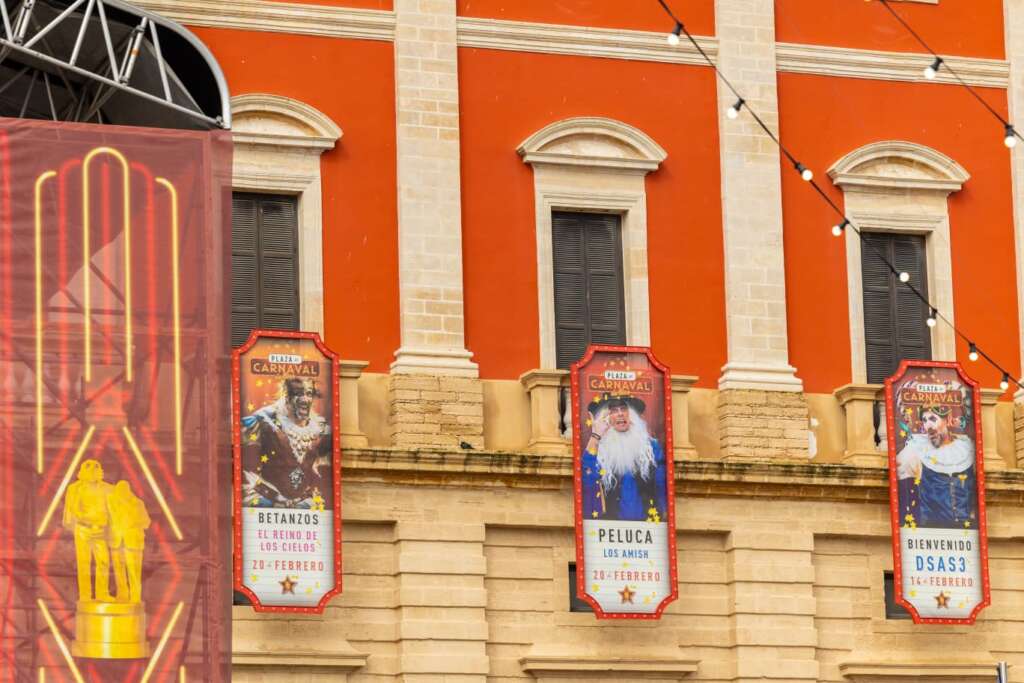 San Fernando ya huele a Carnaval y la Plaza del Rey empieza a transformarse en un gran plató al aire libre. El montaje de la escenografía avanza y el espacio central de la fiesta presenta ya una imagen que recuerda a una gala de los Oscar, iluminación especial y una ambientación inspirada en el cine clásico de los años 50 y 60.