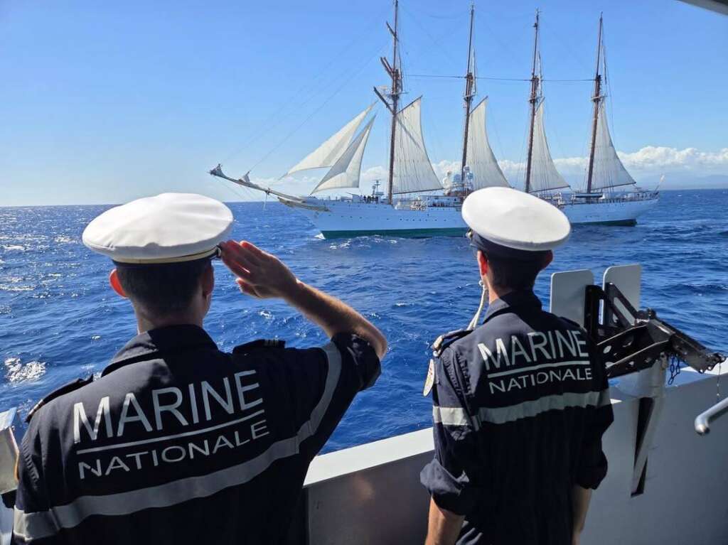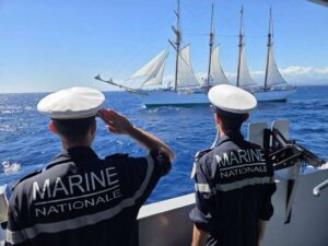 El Buque Escuela Juan Sebastián de Elcano de la Armada Española se cruzó recientemente en alta mar con el patrullero francés Antilles‑Guyane La Combattante, saludándose en un gesto de camaradería naval y tradición marítima.
