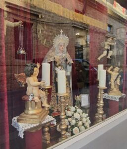 El conjunto instalado en el escaparate está compuesto por una peana, candelabros, enseres, ángeles y doseles de terciopelo burdeos con flecos dorados, además de ceras y flores que completan la escenografía. De esta forma, quienes transiten por esta céntrica calle podrán contemplar durante estas fechas una estampa poco habitual que recuerda a los tradicionales escaparates cofrades.