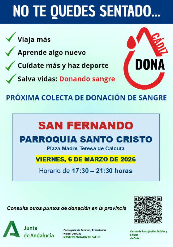 Una vez más desde CTTC de Cádiz piden a la población isleña que donen sangre y plasma, por lo que convocan una nuevas recolecta -en horario de mañana (de 17:30 a 21:30 horas)-, el próximo viernes 6 de marzo de 2026 en la Parroquia Santo Cristo,-Plaza Madre Teresa de Calcuta-.