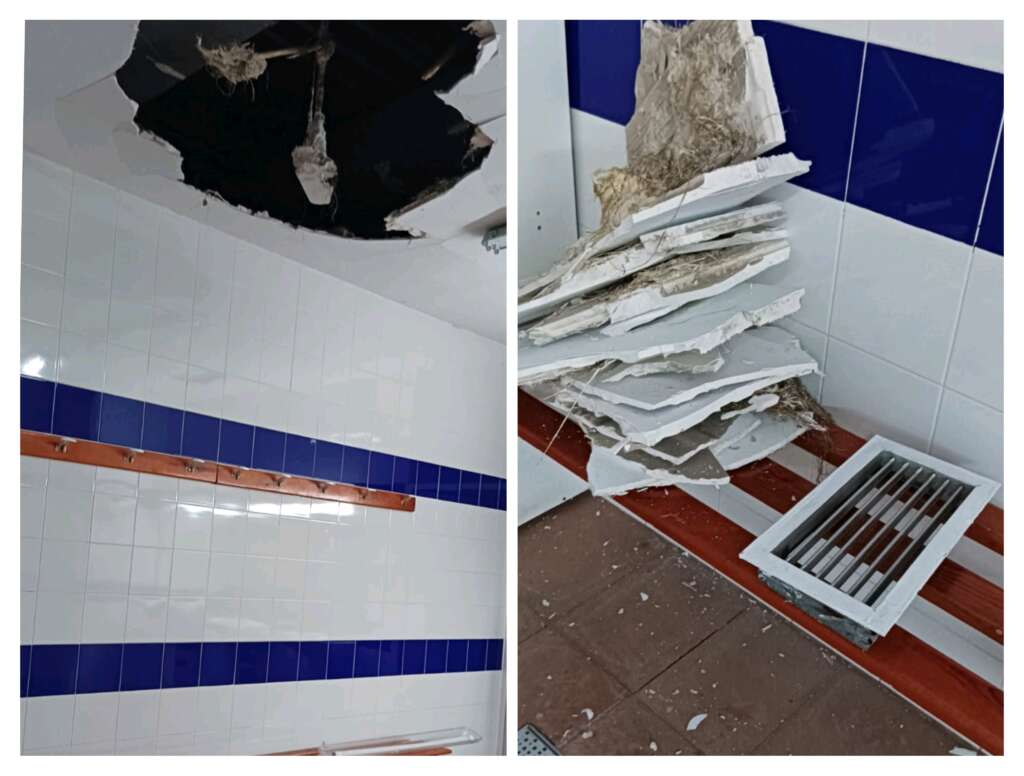 AxSí detalla que las fotografías facilitadas de la ciudad deportiva de Bahía Sur confirman, una vez más, el deterioro de las dependencias y una realidad que “no puede calificarse como una incidencia menor ni puntual”. Las imágenes recopiladas muestran desprendimientos ya producidos, huecos en falsos techos, restos en el suelo en zonas de vestuarios, grietas visibles y signos compatibles con filtraciones persistentes. Entre los elementos más preocupantes, la formación señala la presencia de una luminaria colgando con cableado a la vista en un espacio de uso habitual. “Este problema debe solucionarse de manera inmediata, aunque a la señora Cabada solo le importen las cuestiones estéticas”, señala el coportavoz.