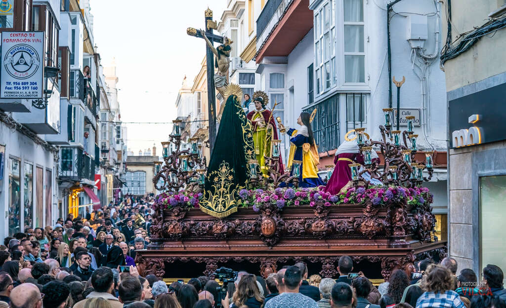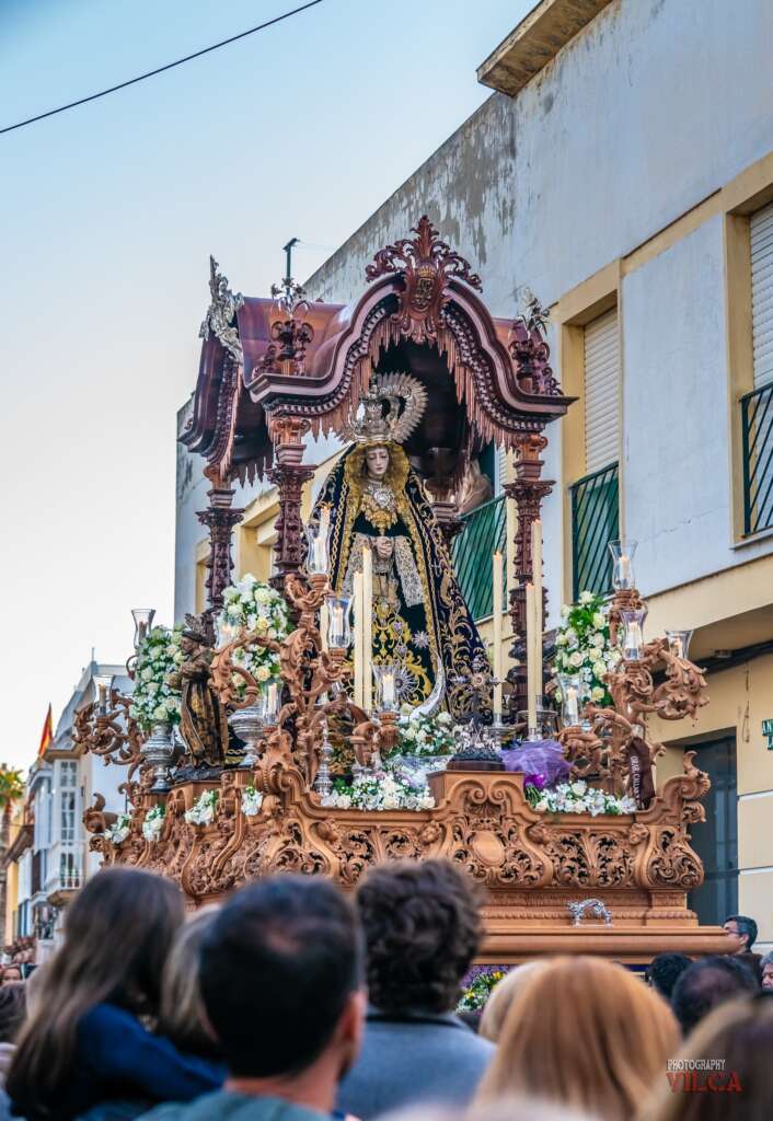 Cerrando el triángulo devocional, a las 19:00 horas se abrían las puertas de la Iglesia Mayor Parroquial de San Pedro y San Pablo para la salida de la Orden Seglar de los Servitas. Bajo una estética recoleta, la Virgen de los Dolores procesionó arropada por los sones místicos de la Capilla de Música Lignum Crucis de San Fernando.